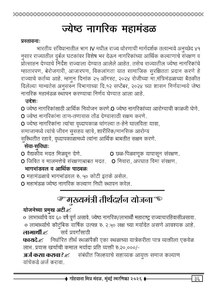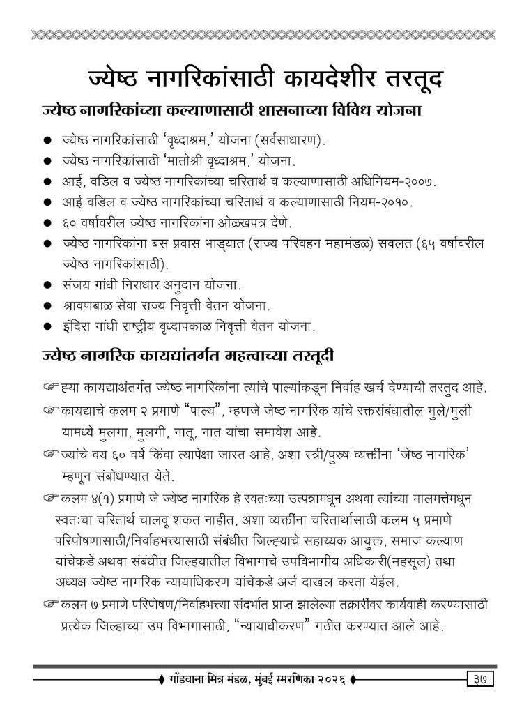 - “ज्येष्ठ नागरिक ओळख पत्र “ काढण्यास मदत करणे