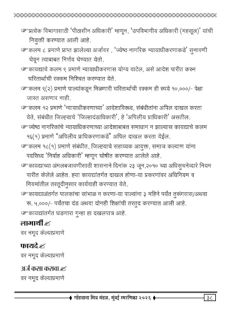 - ज्येष्ठ नागरिकासाठीच्या शासनाच्या विविध सोयीसवलती ची माहिती करून देणे व , त्याचा फायदा घेण्यास प्रोत्साहन देणे